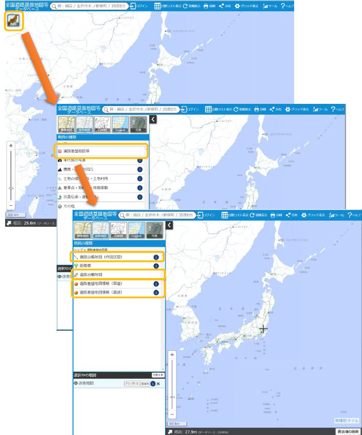 初期表示では日本および周辺の地図のみ表示されます。画面左上の「地図」メニューから「道路基盤地図等」を選択すると、データベース内の情報がリスト表示されます。