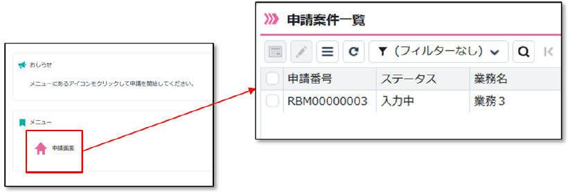 申請管理システムにログインし、「メニュー」にある「申請画面」のアイコンをクリックすると、申請業務のリストが表示されます。