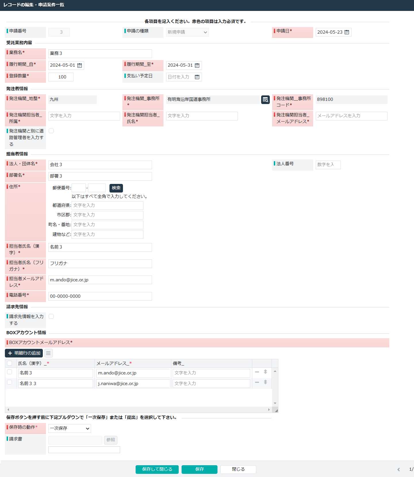 | BOX アカウント情報 | 〇 | 受注業務にて、道路台帳附図を格納する BOX のフォルダにアクセスしたいユーザのメールアド レス、氏名を入力してください。 発注者はすでに利用登録済のため、発注者のメール アドレス・氏名は入力不要です。 |
