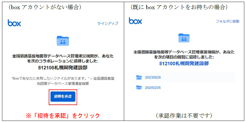 申請受付後、「boxアカウント情報」に記入されたメールアドレスに対してデータベースのファイル格納用のクラウドストレージ(box)のアクセス権限を付与します。各メールアドレス宛に以下のような招待メールが送信されますので承認をお願いします。 (既にboxアカウントがあるかどうかで招待画面が異なります)
