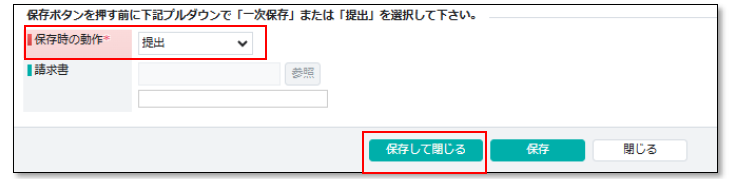 必要事項を入力後、画面下部の「保存時の動作」で「提出」を選択し「保存して閉じる」をクリックすると申請が提出されます。