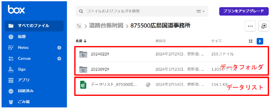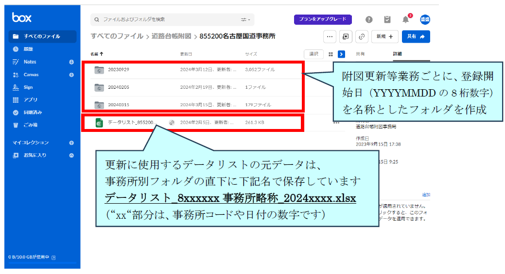クラウドストレージ(box)上の国道事務所別のフォルダ直下にデータ登録開始日を名称と