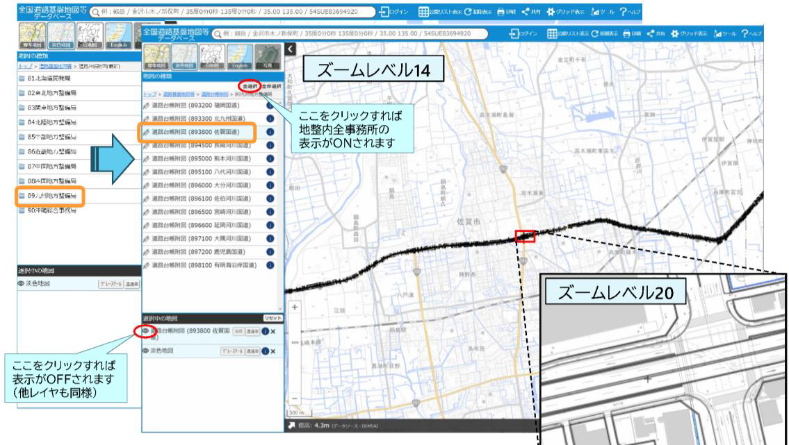 道路台帳附図の地図表示は事務所ごとに設定します。道路台帳附図のメニューを開くと地方整備局のリストが表示され、これを開くと事務所のリストが表示されます。