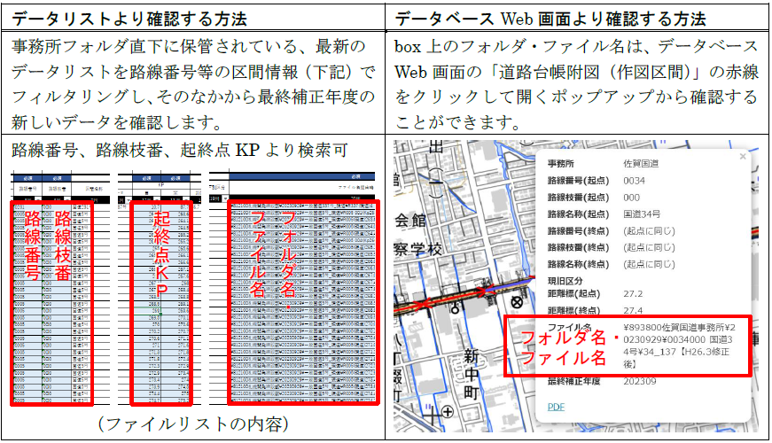 | 事務所フォルダ直下 のデータリスト | エクセルシ ート | 全国道路基盤地図等データベ ースで公表中のデータの一覧 情報です。 道路台帳附図の更新前の情報 として管理運営機関が最新版 を保存します。 | |