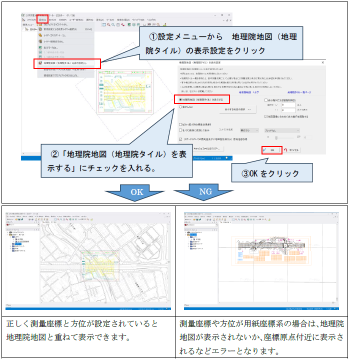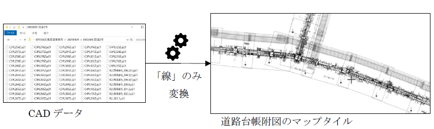 す。マップタイルにはCAD データ上で「線」で描画されたもののみを変換します。文字列や