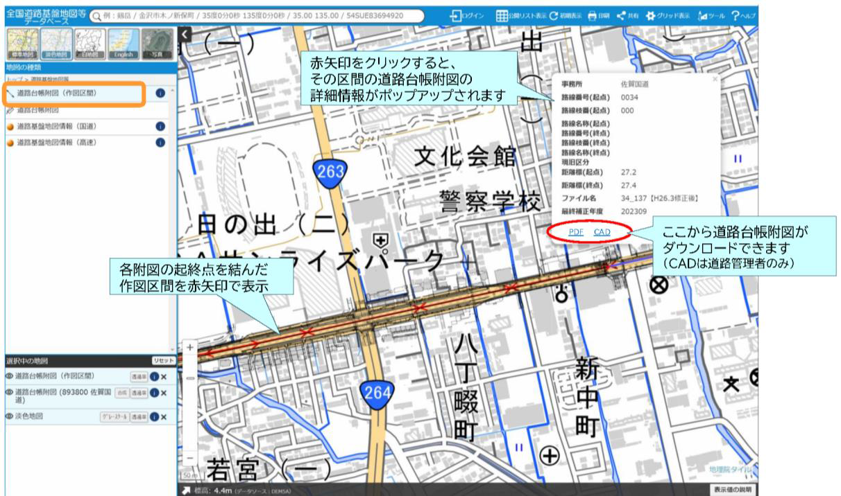 道路台帳附図(作図区間)を選択すると、各附図の起終点を座標変換した点を直線で結んだ赤線が表示されます。赤線をクリックすると道路台帳附図の詳細情報とファイルへのリンクがポップアップ表示されます。道路管理者IDでログインしている場合はCADデータへのリンクも表示されます。