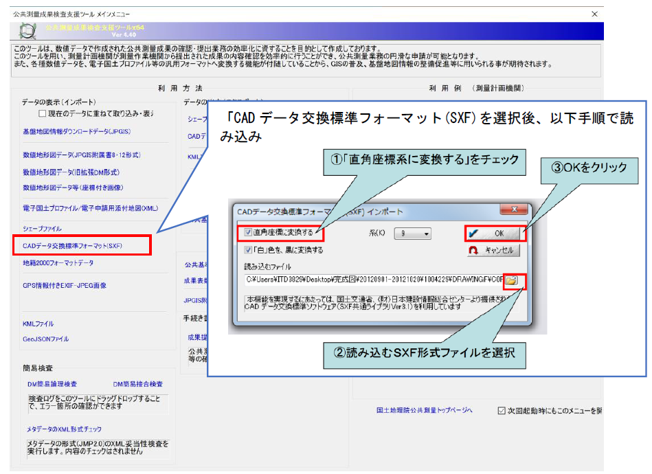 | 4 | CAD データの座標系は世界測地系の平面直角座標(JGD2011)ですか? 旧測地系を利用している場合、その内容をデータリストに記載しました か? | □はい |