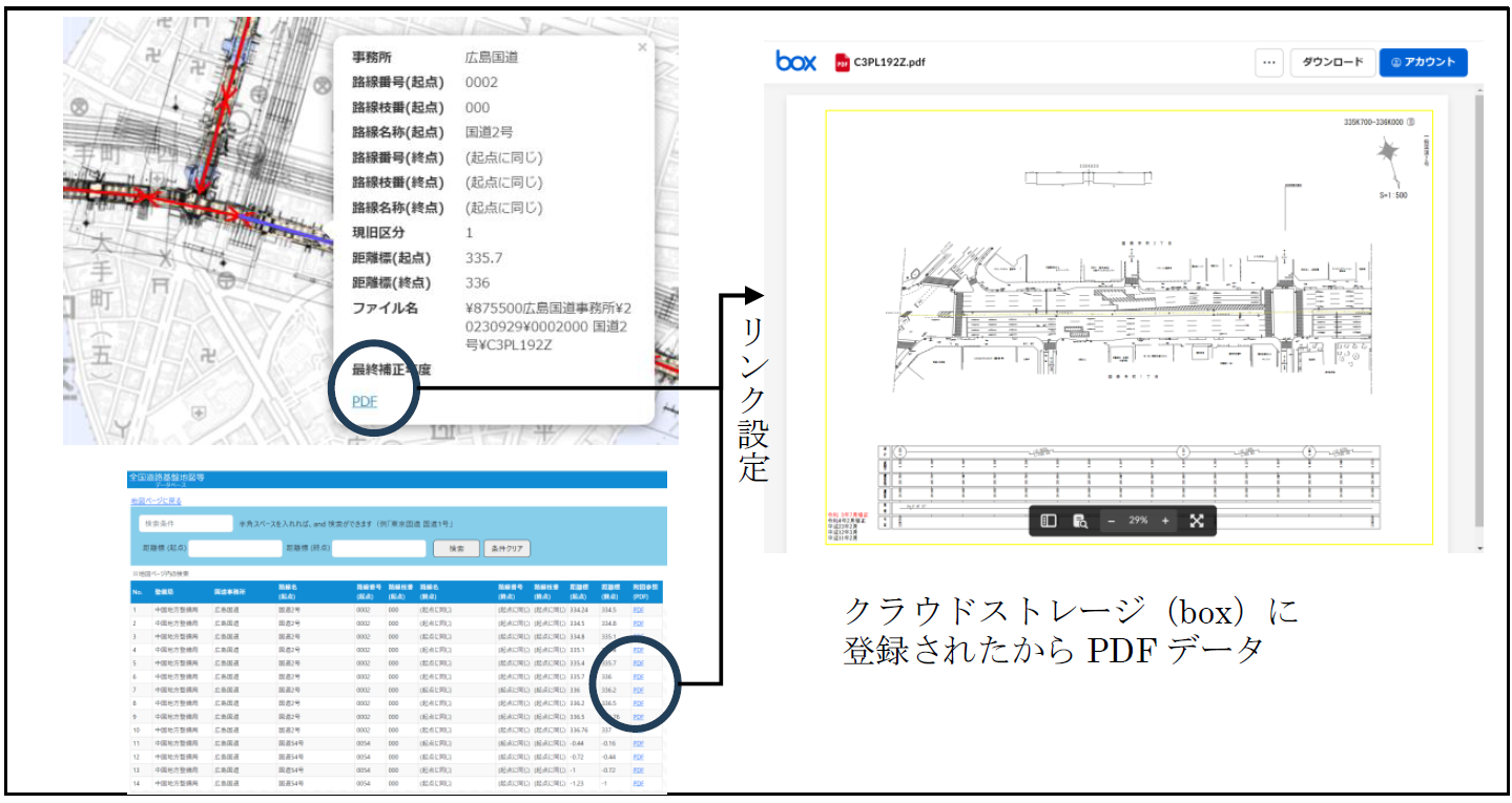 クラウドストレージには、国道事務所ごとの道路台帳附図のデータとデータリストが保存されています。