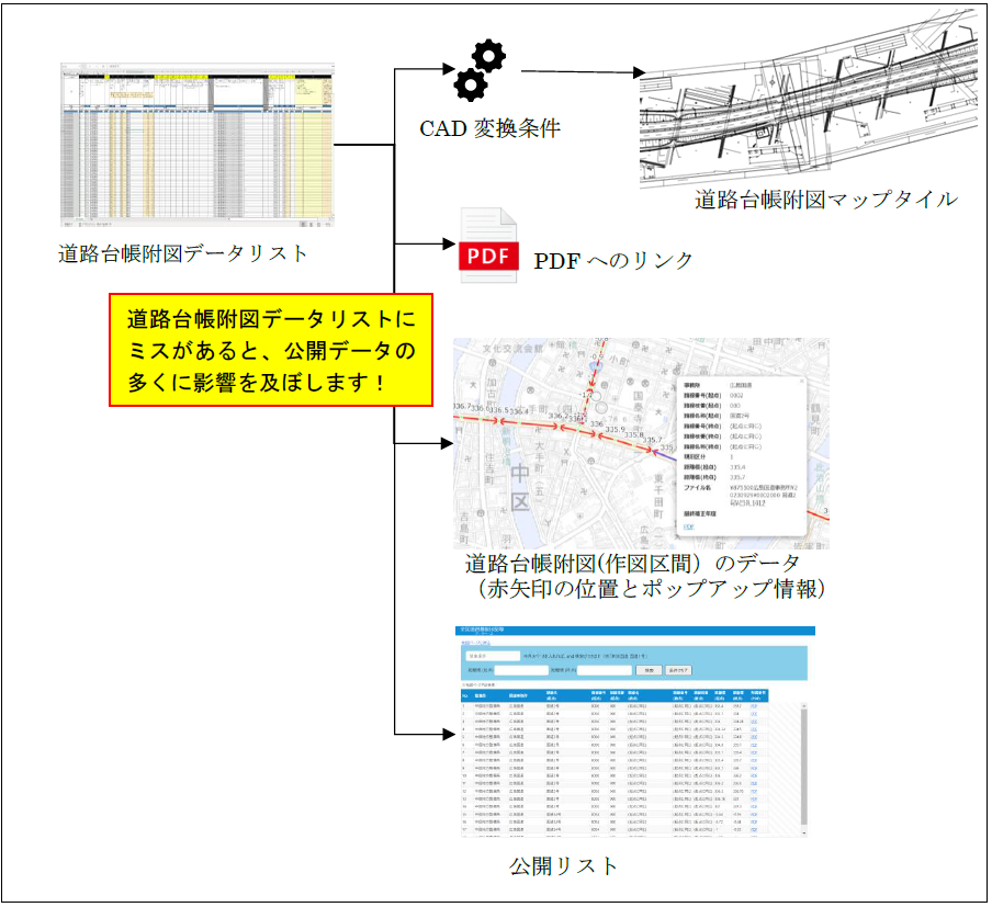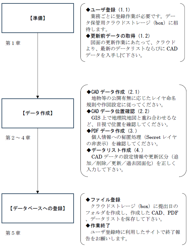 道路台帳附図作成・更新業務により作成した道路台帳附図データ(CADデータ、PDFデータ、作図区間リスト)は、業務受注者によりデータベースに登録します。