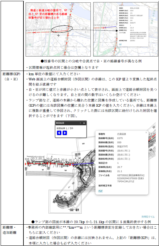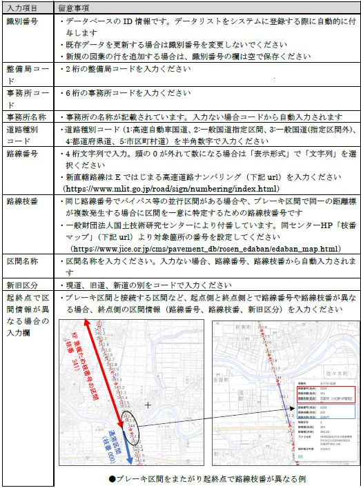 | 9 | データリストの KP 自・KP 至の数値は、km 単位の数値で入力していま すか?また、ランプ部などの記載図郭が本線に隣接する場合などは、本 線と同じ路線枝番号の時は本線位置付近の KP の数値を記載しました か? | □はい |