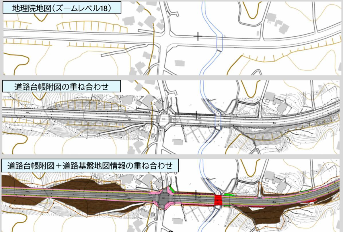 道路基盤地図情報を選択すると、地物別に色分け区分された道路基盤地図情報が表示されます。地理院地図、道路台帳附図との重ね合わせイメージは以下に示すとおりです。