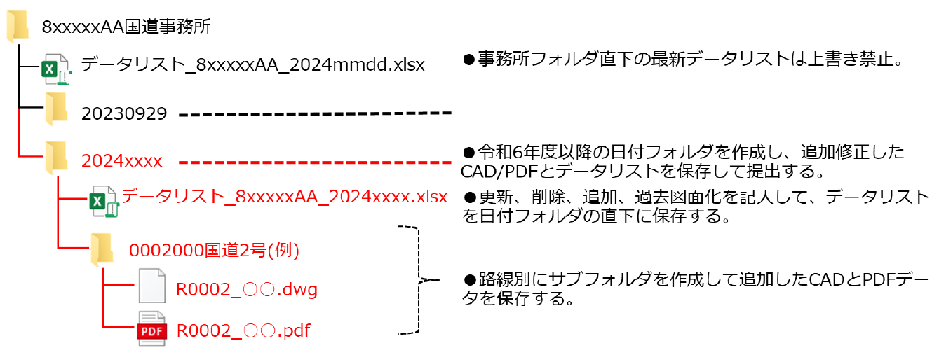 それぞれの国道事務所のフォルダの中は、データリスト、提出日付別に保存されたサブファ