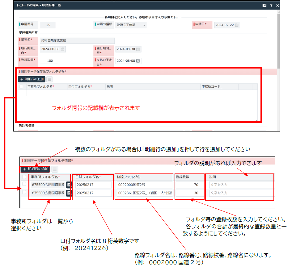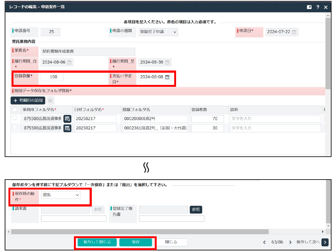 登録完了申請画面では、最終的な登録数量と支払い予定日及び地図データ保存先フォルダ情報を入力してください。