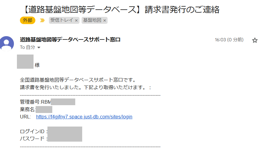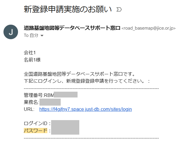 入力したメールアドレスに、データベースサポート窓口より申請システムへのログイン情報(url、ID、パスワード)が返信されます。