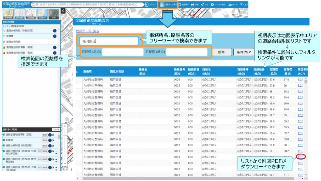 上部の公開リスト表示メニューにより、地図表示中の道路台帳附図がリスト表示されます。フリーワード検索によるリストの絞り込みも可能です。