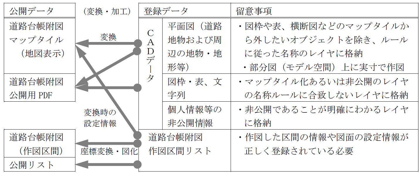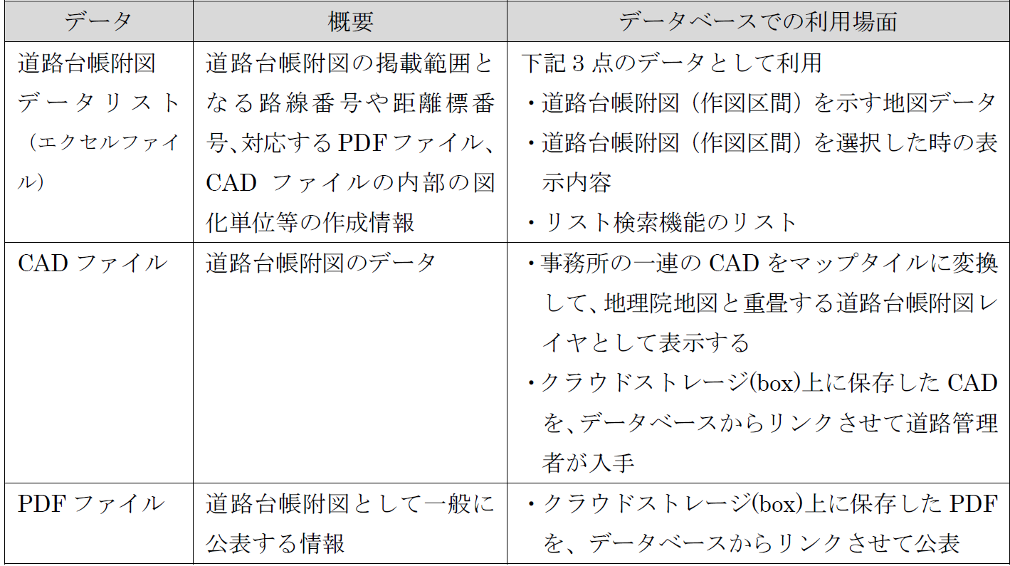 表 1 道路台帳附図の公開に使用するデータ データ 概要 データベース