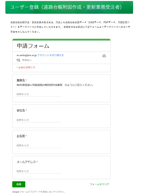 ユーザー登録フォーム(https://www.jice.or.jp/road_basemap/road_basemap06/)に、業務名および連絡先を入力し送信ボタンを押します。